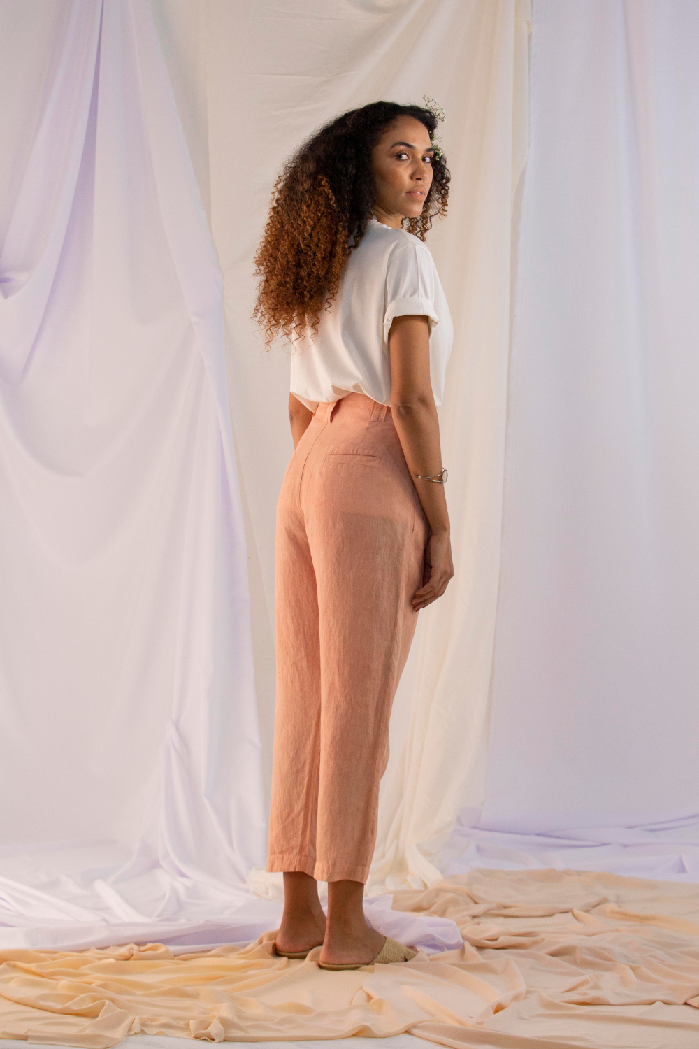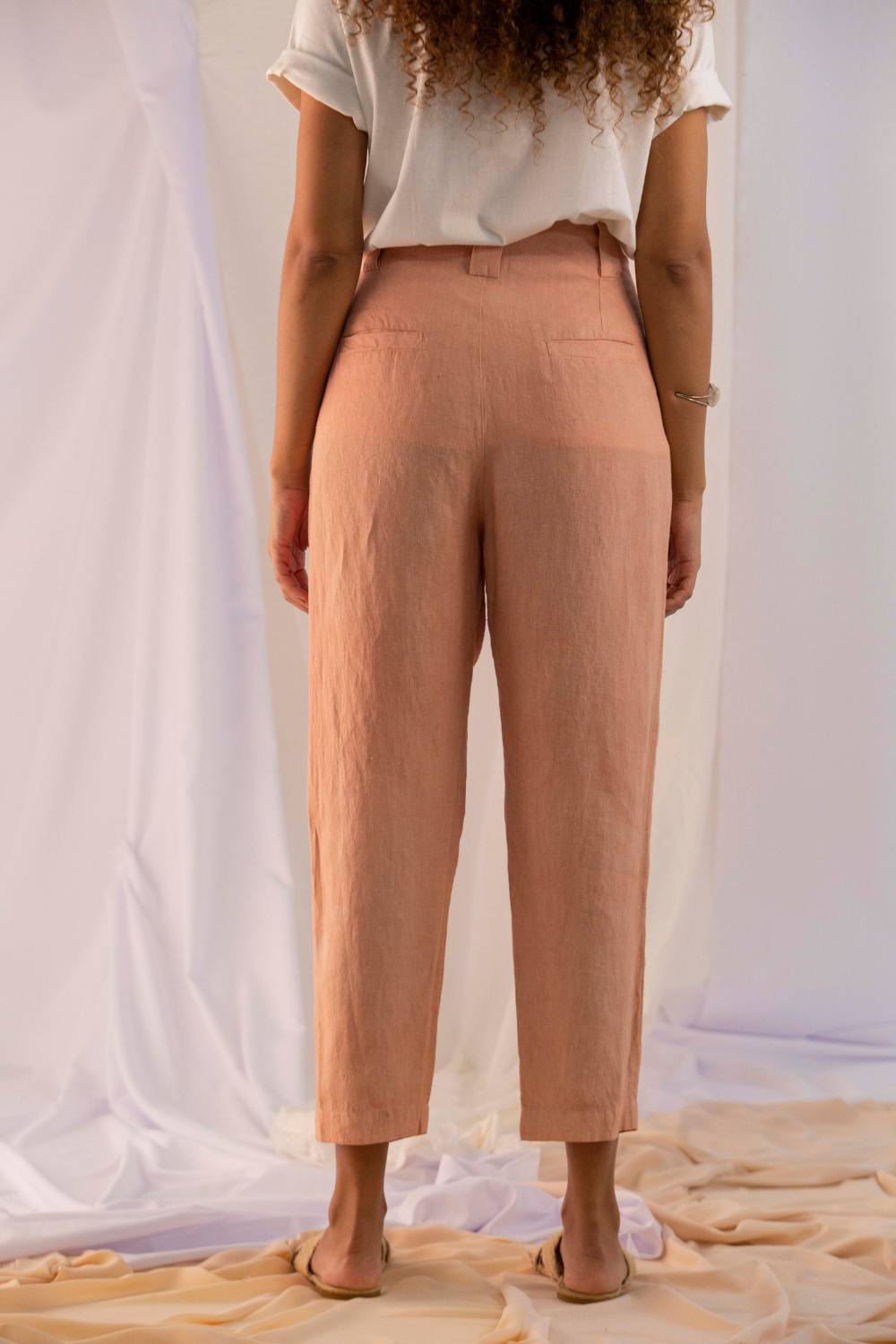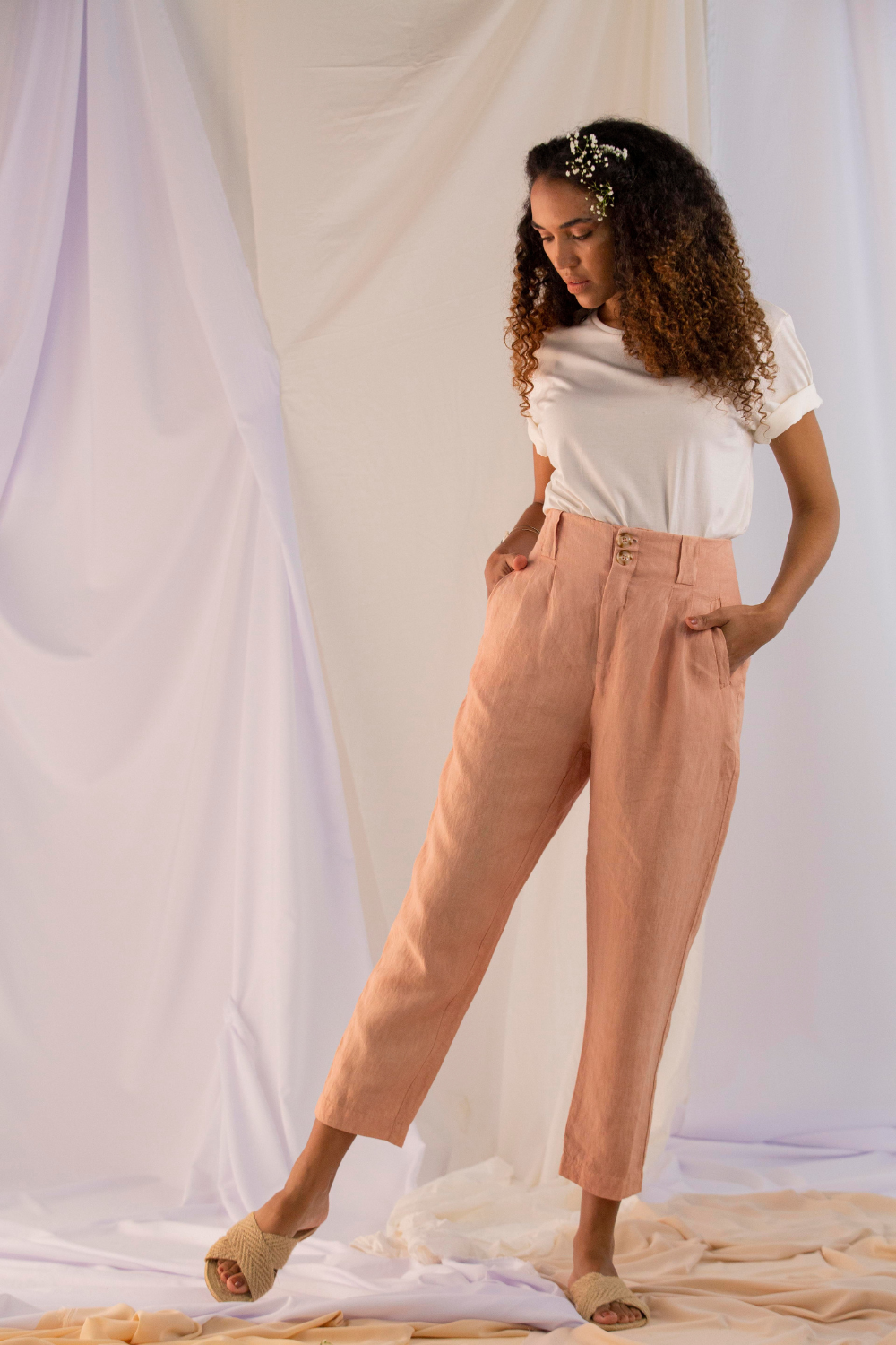 'These high-waisted versatile and elegant linen trousers feature stylish front pleats and buttons, handy side and rear pockets as well as belt loops detailing for an added flattering touch!