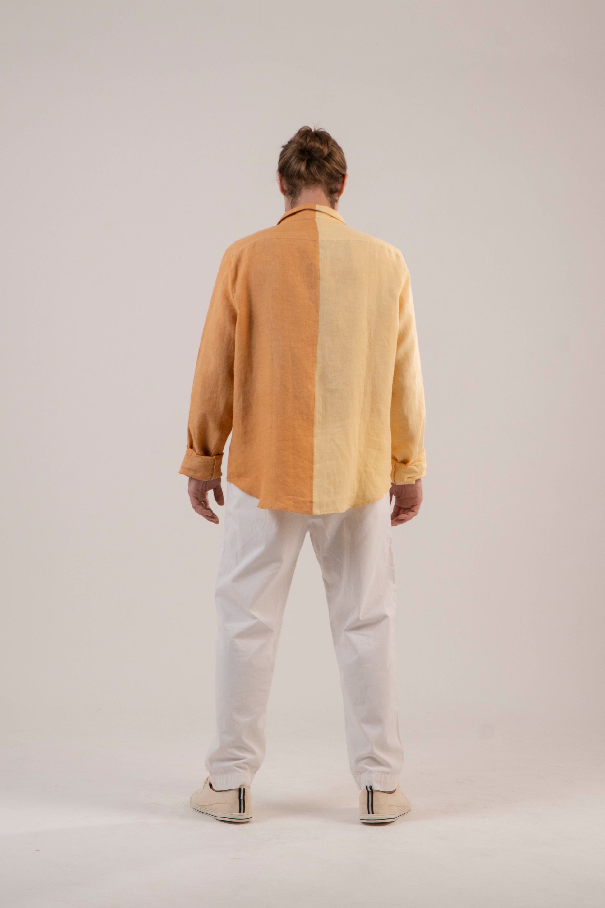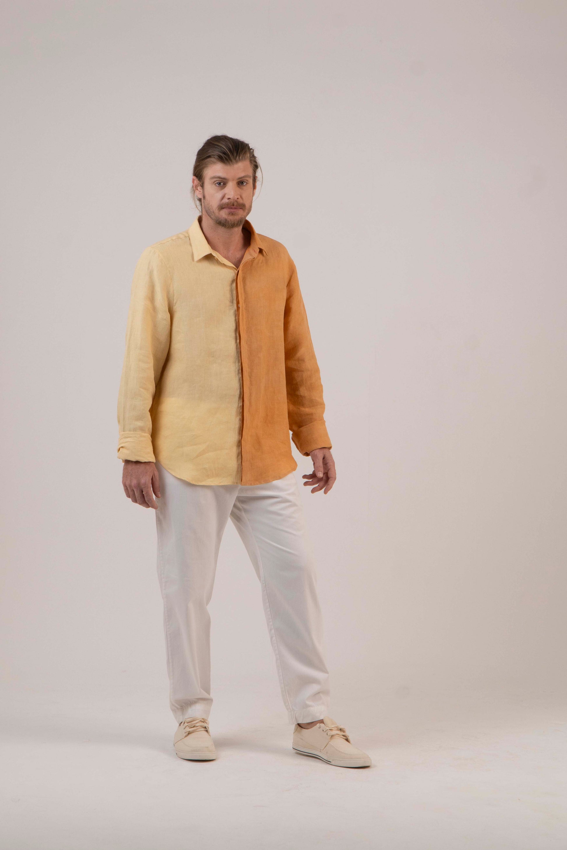 Camisa agênero de manga longa confeccionada em 100% linho orgânico, apresentando um design atemporal e versátil, com barra reta e fechamento embutido com botões. A peça é tingida naturalmente com o amarelo vibrante das cascas de cebola e o laranja intenso do urucum. O contraste entre essas cores cria um visual alegre e descontraído dentro de um design clássico.
