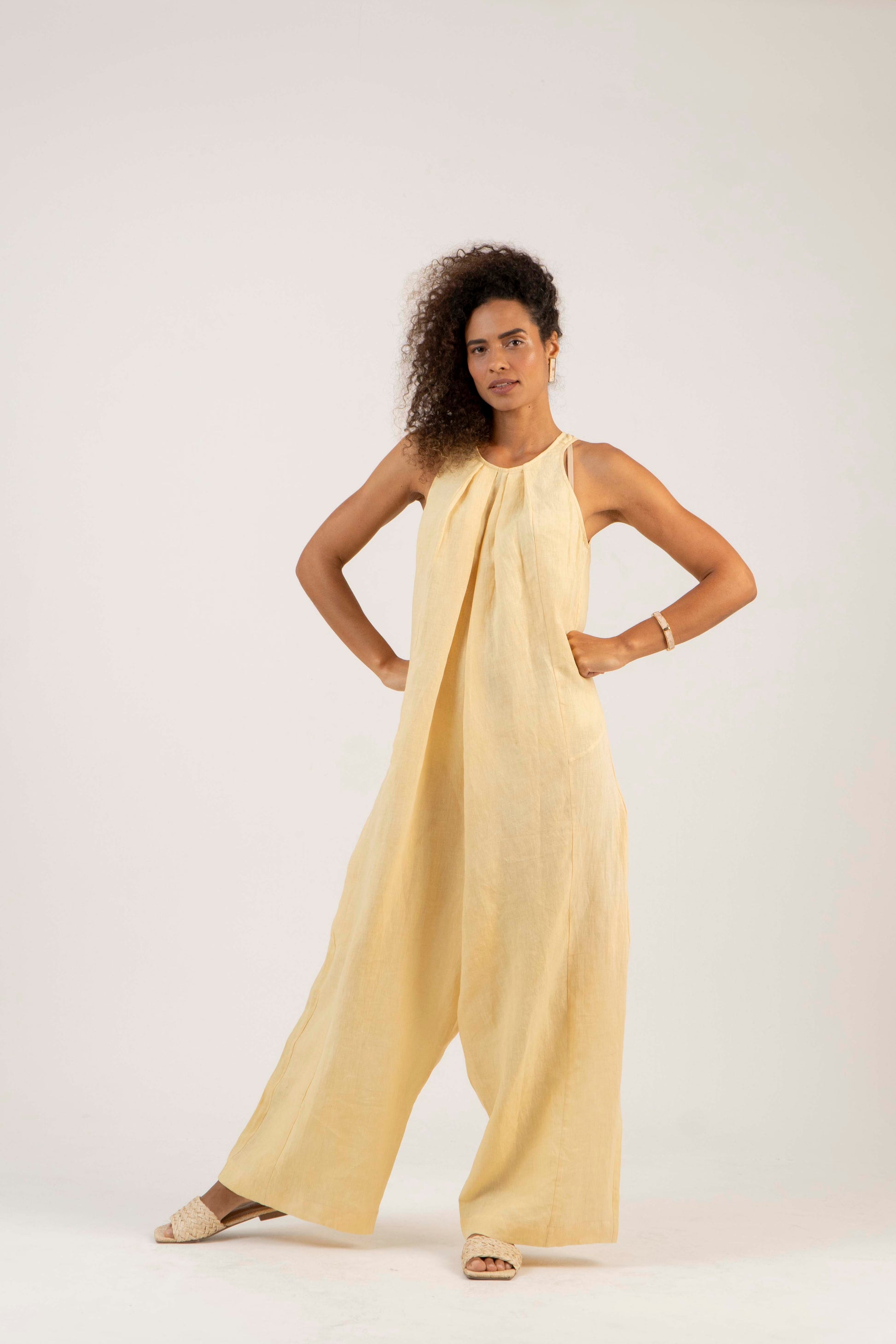 Macacão longo confeccionado em linho 100% orgânico, amplo, com pregas frontais e traseiras e fechamento por botão nas costas. Sofisticado, elegante, atemporal e perfeito para diversas ocasiões.