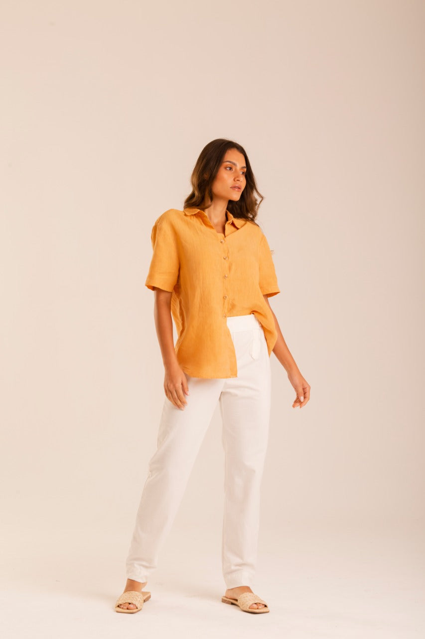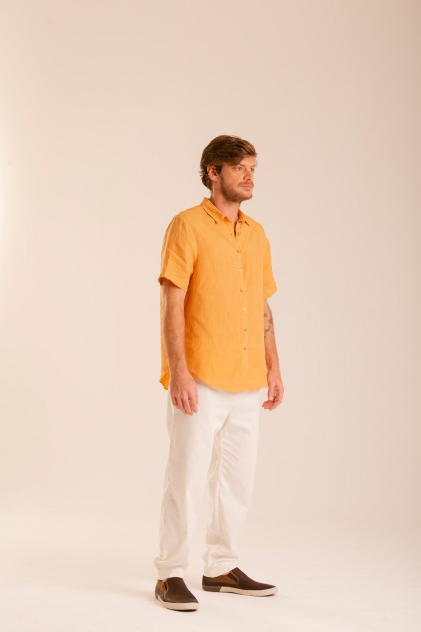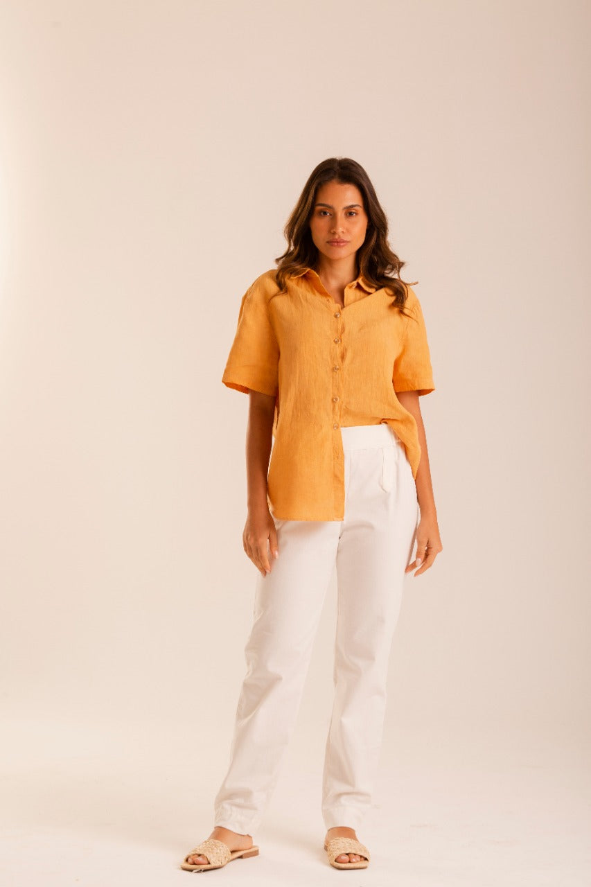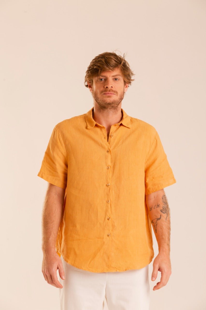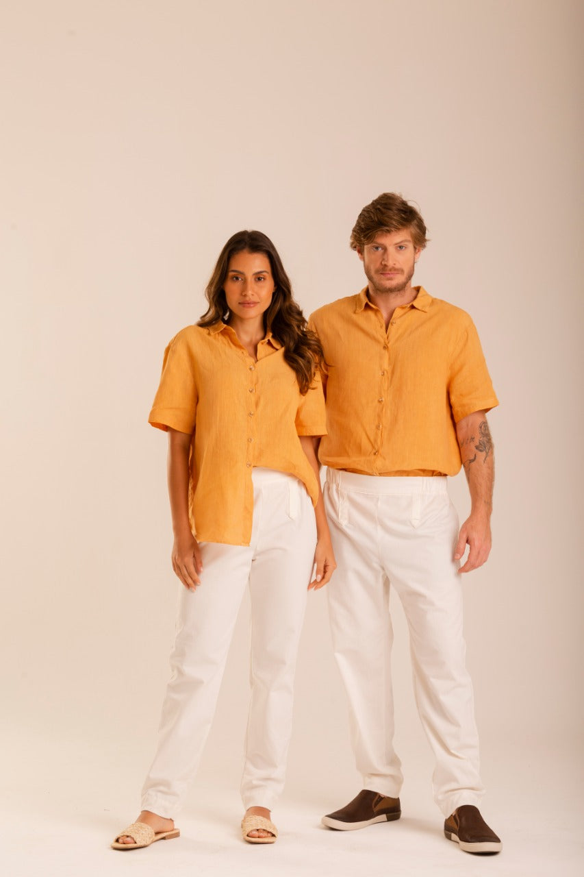 Camisa confeccionada em 100% linho orgânico, com modelagem agênero e atemporal, de corte reto, manga curta e fecho frontal com botões. Um clássico na cor branca e amarelo que coroamos com o tingimento natural com cascas de cebola, conferindo-lhe um tom exclusivo. Nas fotos, mulheres vestem P e homem G.