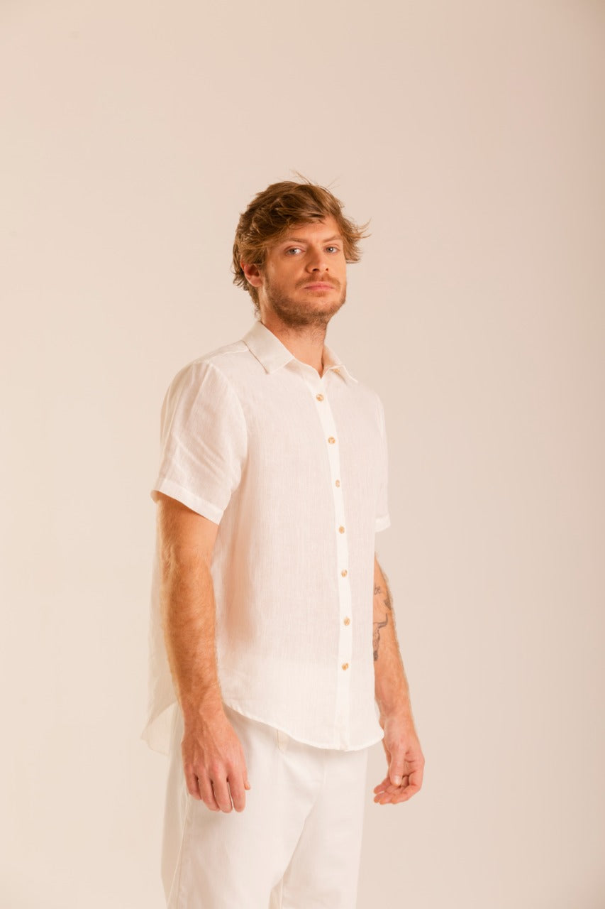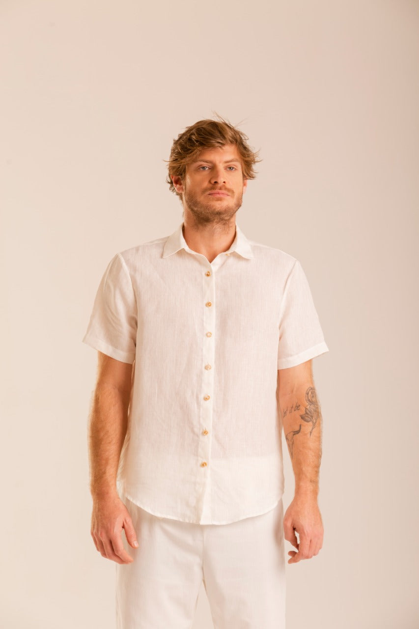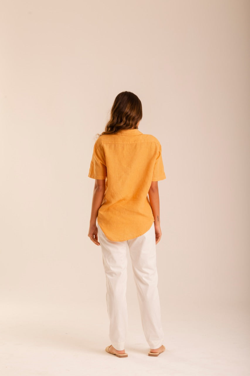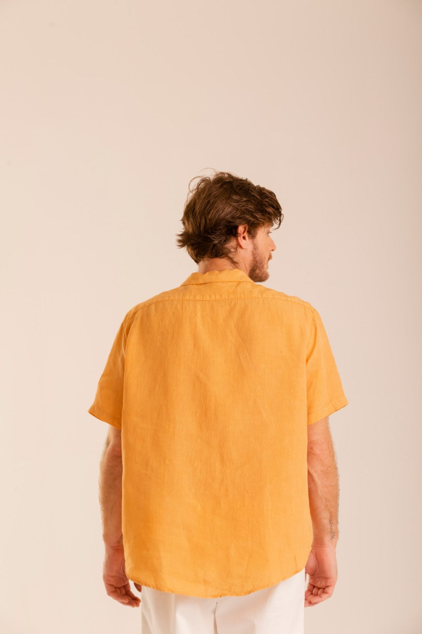 Camisa confeccionada em 100% linho orgânico, com modelagem agênero e atemporal, de corte reto, manga curta e fecho frontal com botões. Um clássico na cor branca e amarelo que coroamos com o tingimento natural com cascas de cebola, conferindo-lhe um tom exclusivo. Nas fotos, mulheres vestem P e homem G.