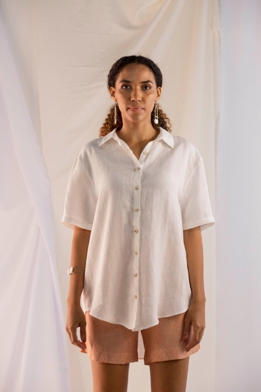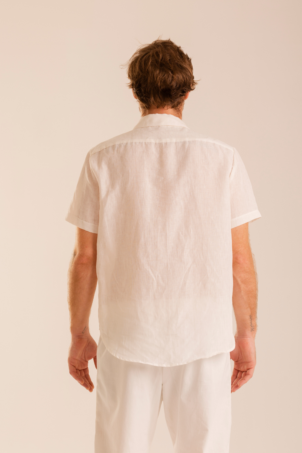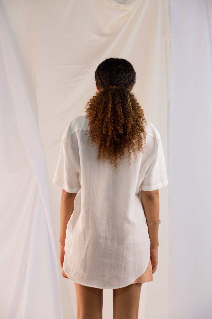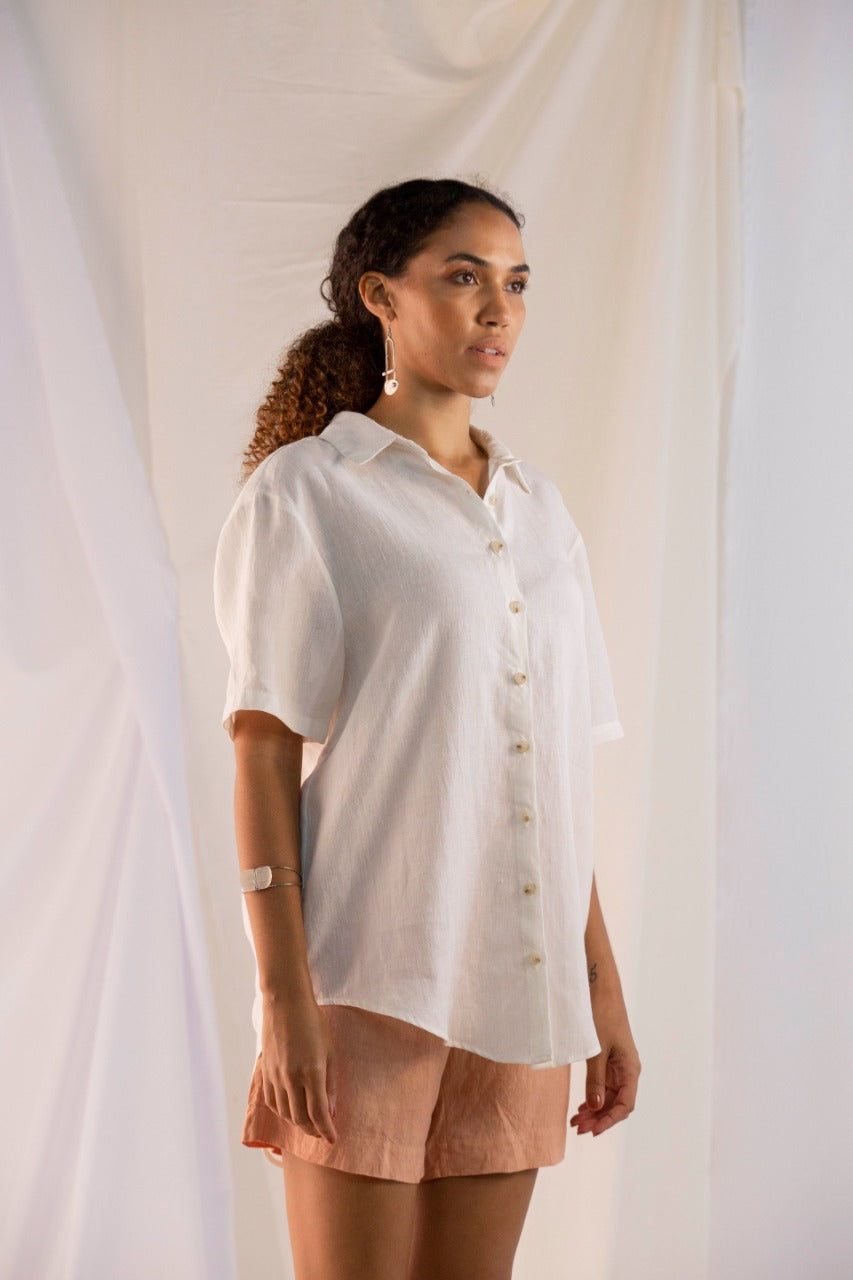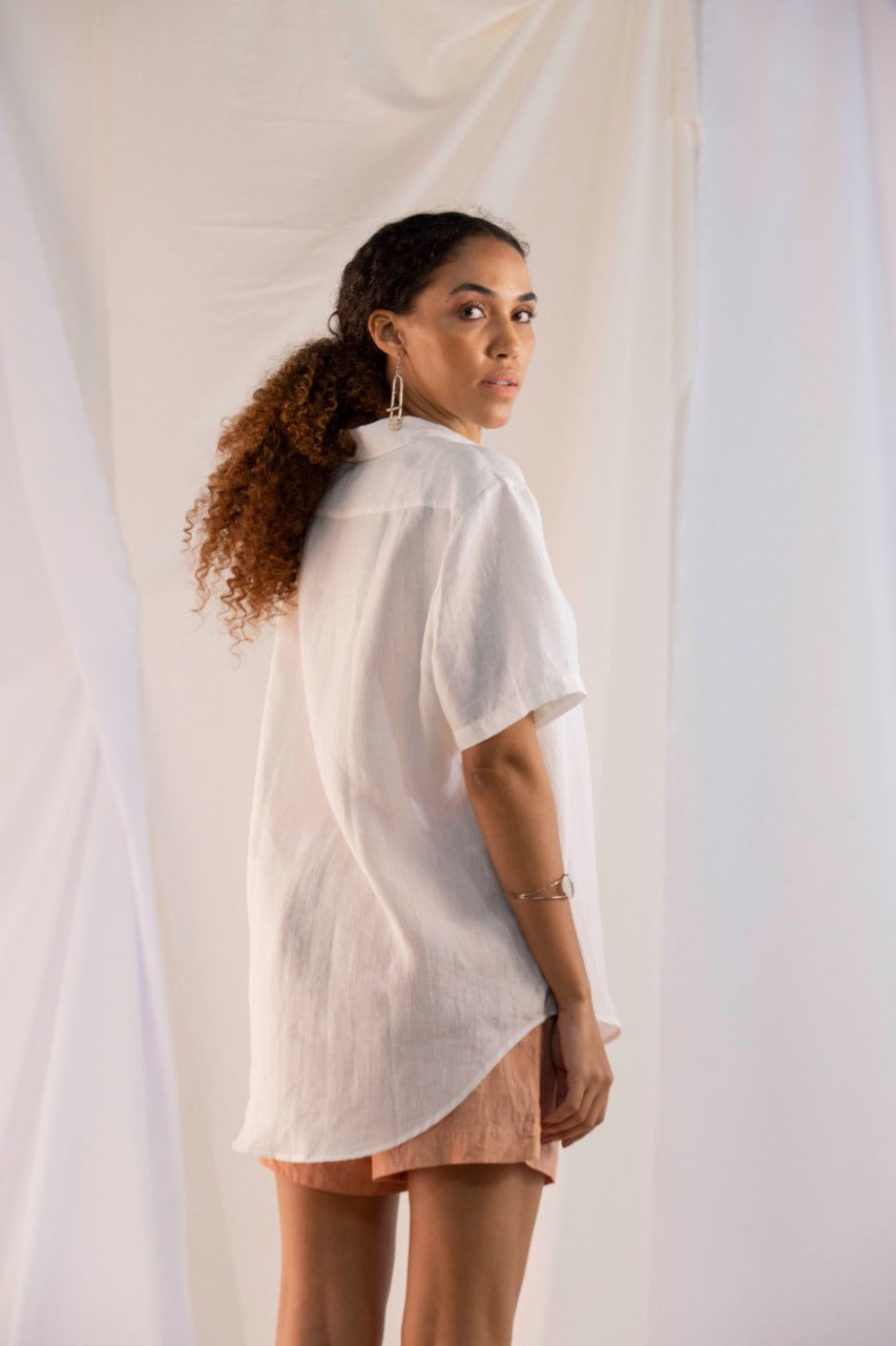 Camisa confeccionada em 100% linho orgânico, com modelagem agênero e atemporal, de corte reto, manga curta e fecho frontal com botões. Um clássico na cor branca e amarelo que coroamos com o tingimento natural com cascas de cebola, conferindo-lhe um tom exclusivo. Nas fotos, mulheres vestem P e homem G.