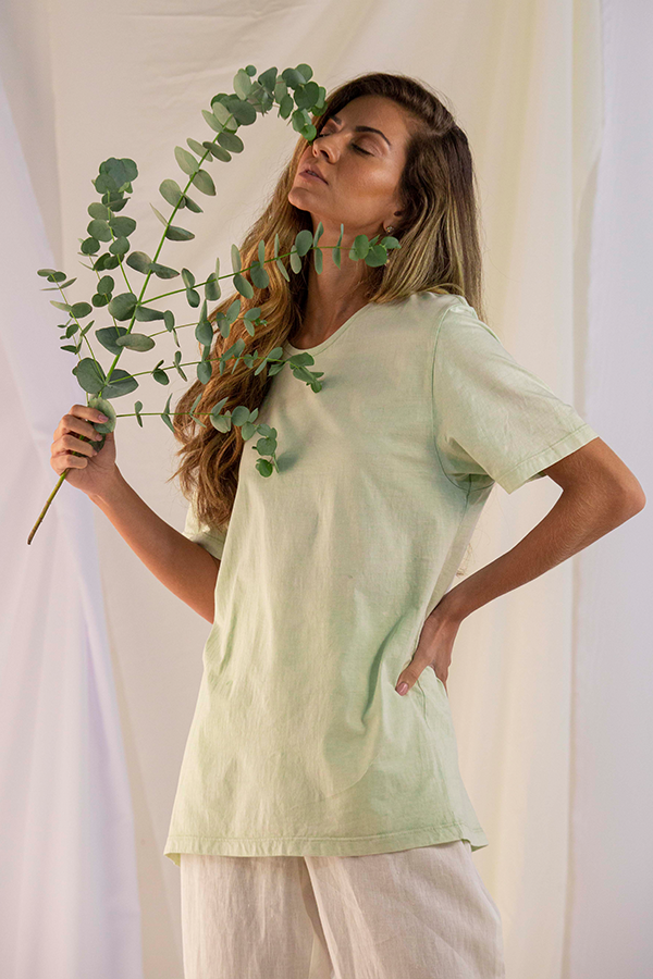 Camiseta básica de corte reto e com modelagem agênero e atemporal que confere praticidade e conforto ímpar para usar em qualquer estação. Feita em 100% algodão orgânico com certificado gots*, a peça oferece um toque super macio garantindo bem-estar e respirabilidade à tua pele. Esta camiseta é tingida artesanalmente com pigmentos 100% naturais e está disponível nas cores branca, laranja (urucum), amarela (cascas de cebola), verde suave (alfafa), rosa (crajiru) e lilás (pau campeche).