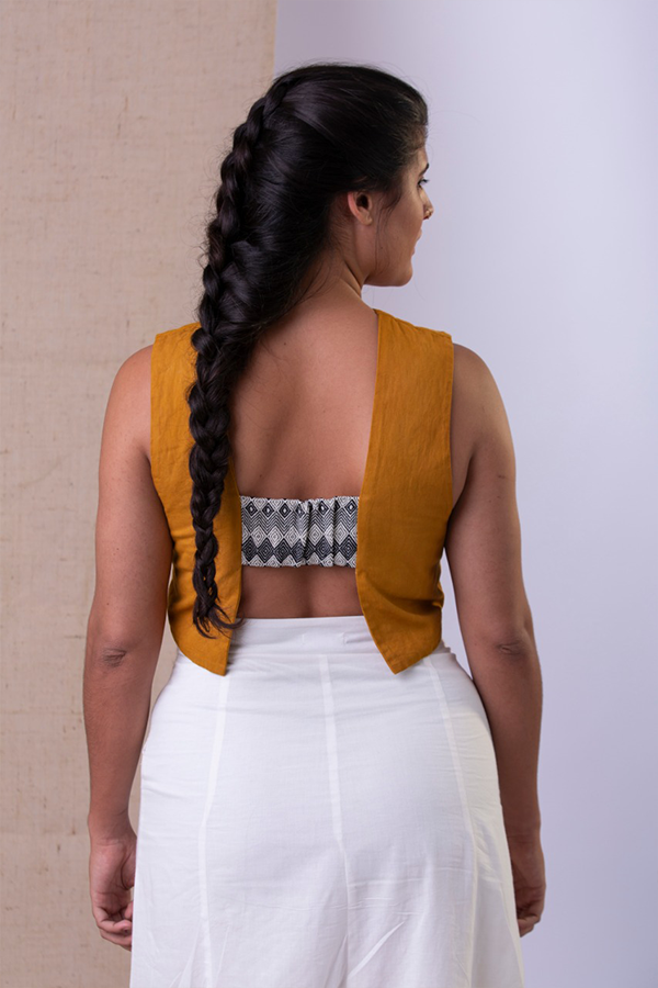 O pigmento 'açafrão da terra' foi fornecido pela 'Etnobotânica'  que adota a agricultura familiar em parceria com cooperativas e associações que habitam o Cerrado, os campos do Sul, a Amazônia e o sertão Brasileiro. Peça tingida por Leka Oliveira do ' Studio In Blue Brazil'.