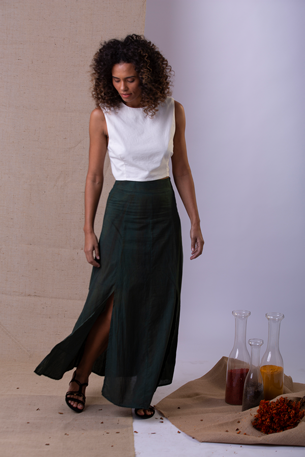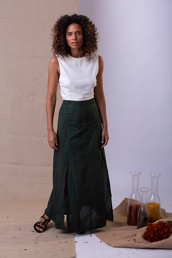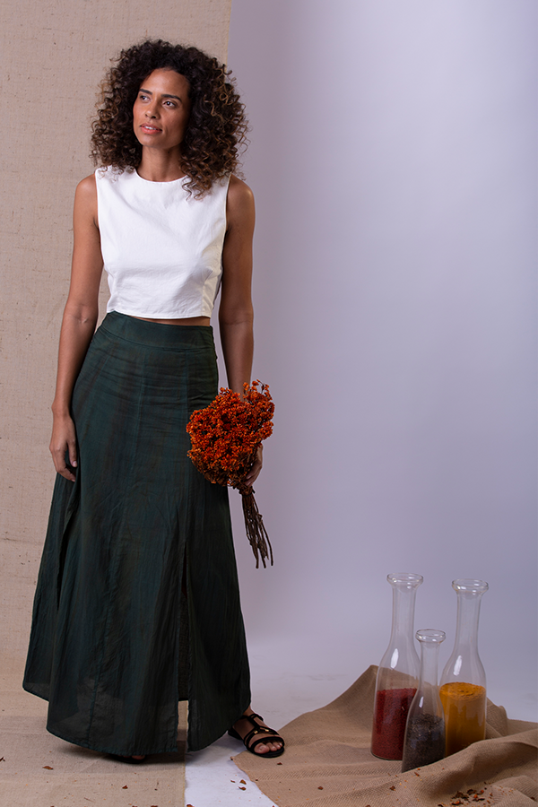 Saia longa verde com fendas frontais até os joelhos garantindo estilo e liberdade aos movimentos. A peça é confeccionada em algodão orgânico brasileiro da Etno Botânica com certificado GOTS e tingida naturalmente com o pigmento vegetal chá mate.